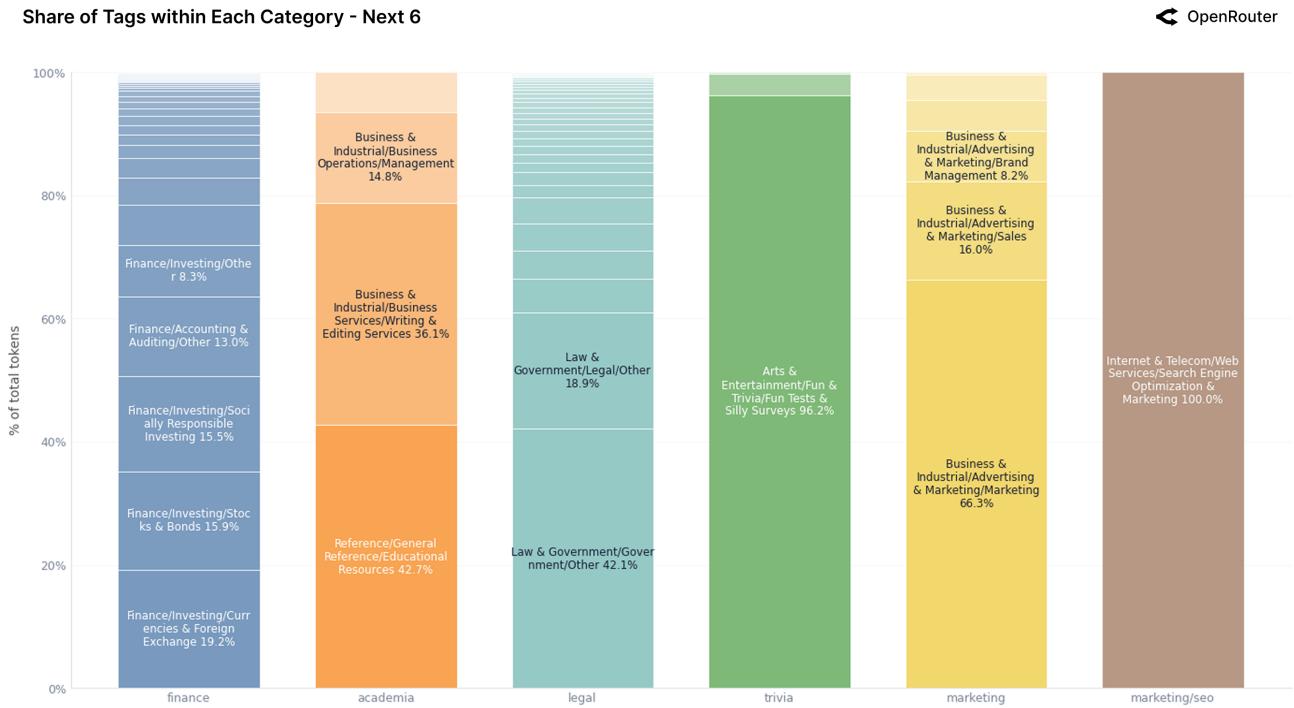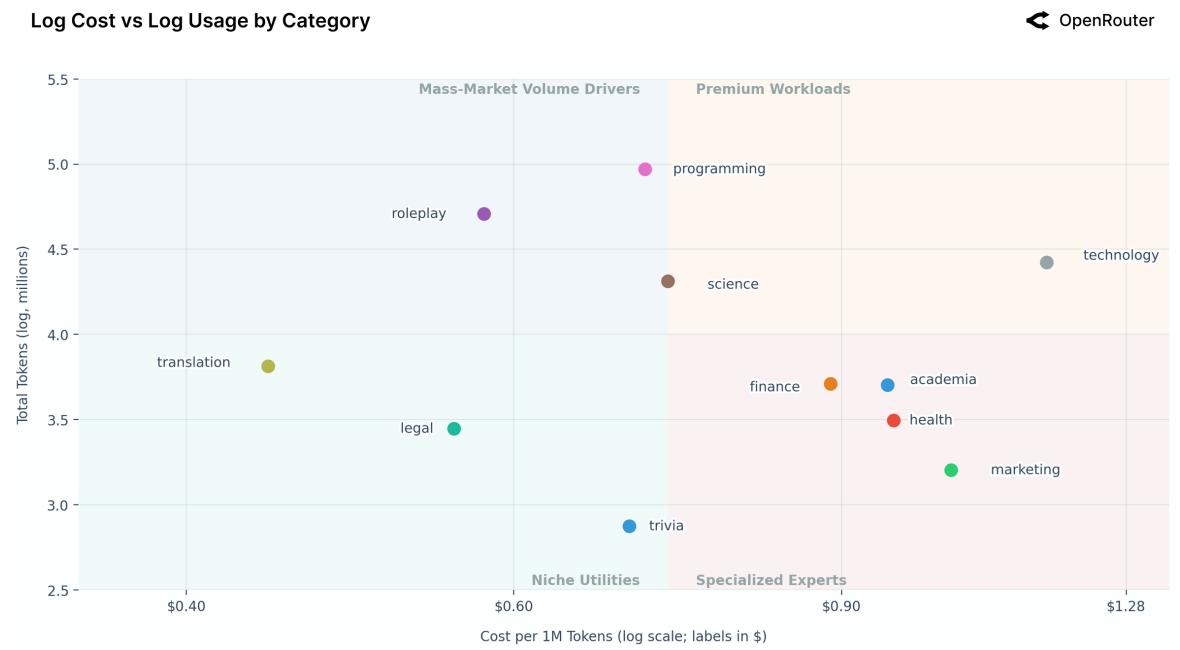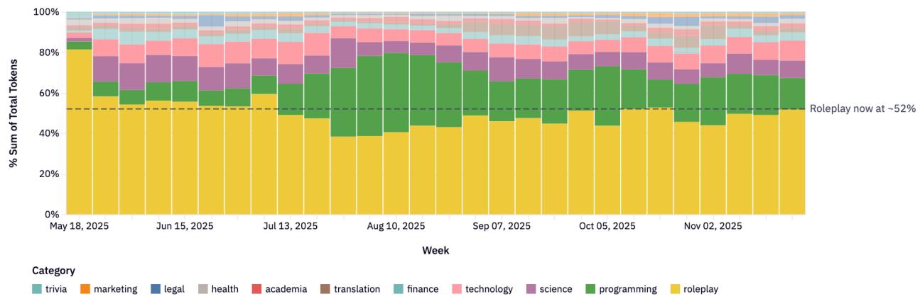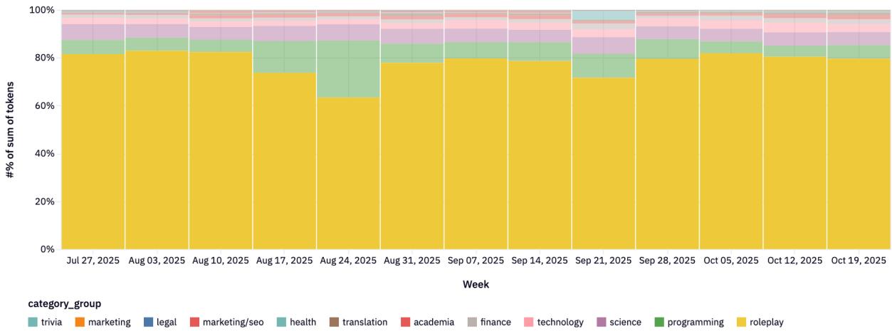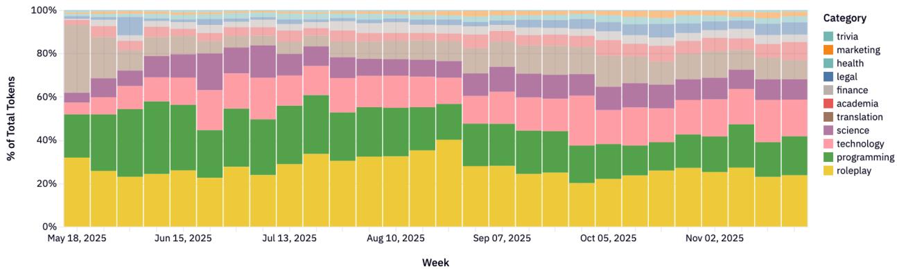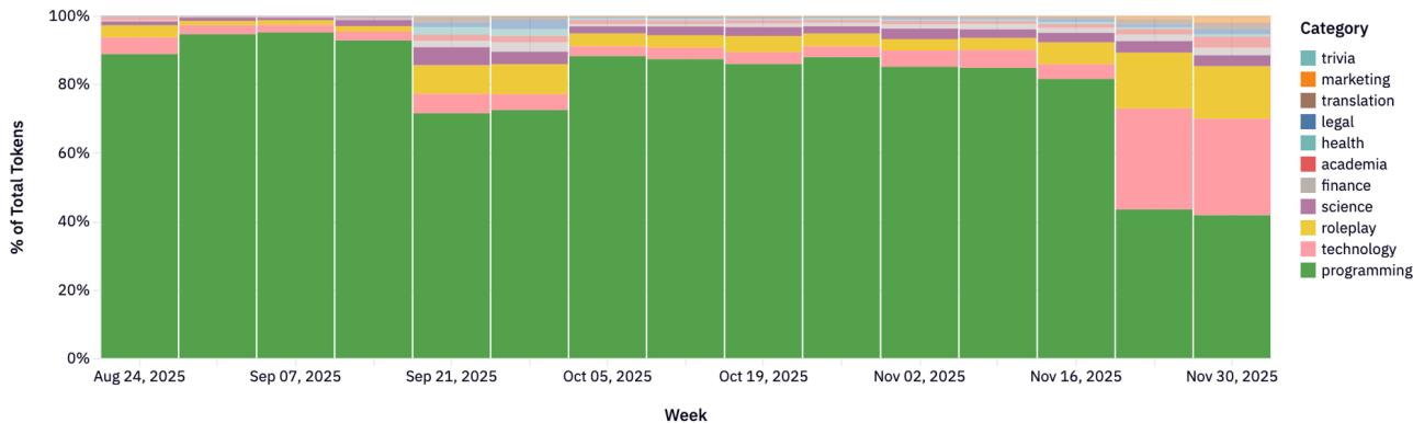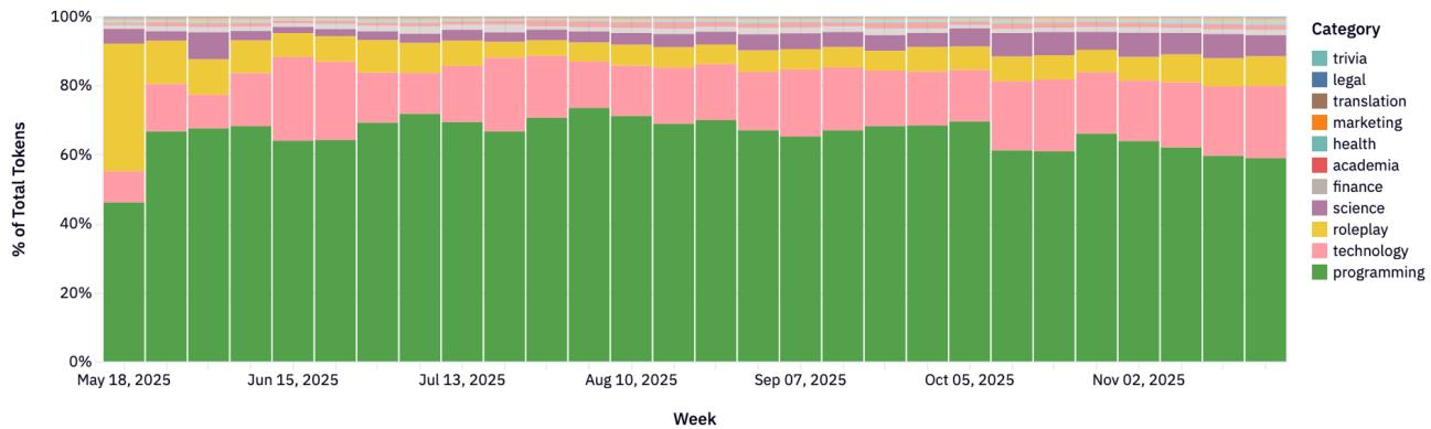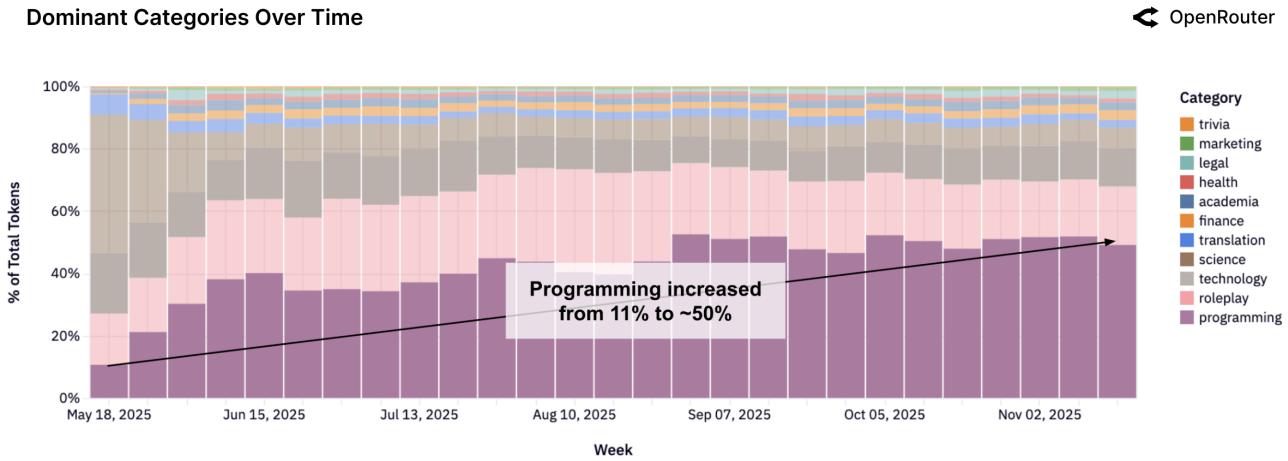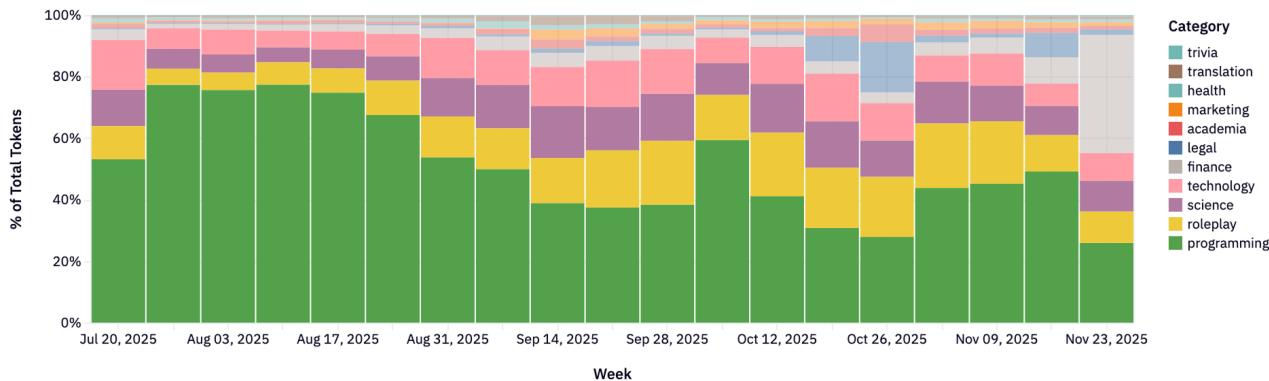Наш анализ основан на метаданных, собранных с платформы OpenRouter. Набор данных состоит из анонимизированных метаданных на уровне запросов для миллиардов пар «промпт-завершение» от глобальной пользовательской базы. Мы используем классификатор GoogleTagClassifier для категоризации контента (Programming, Roleplay, Translation и т.д.).