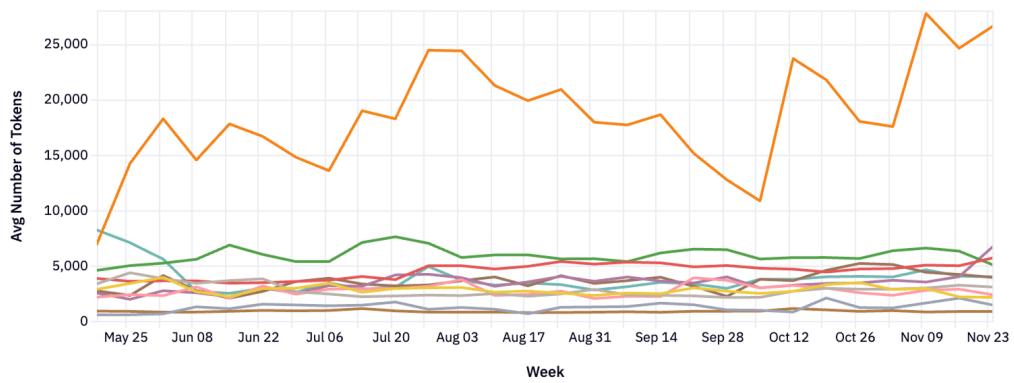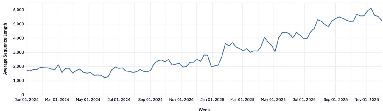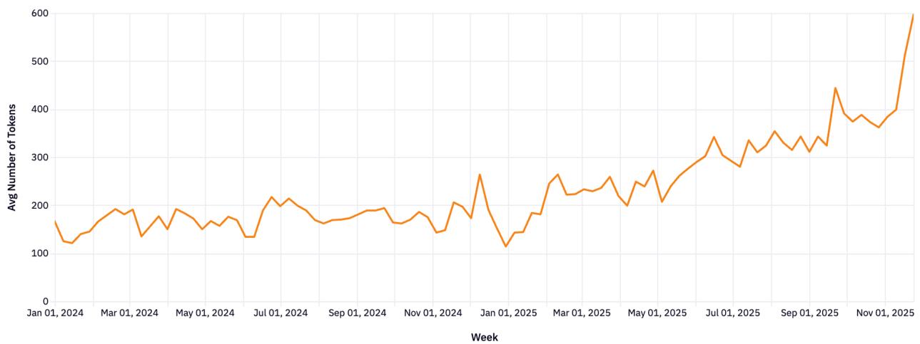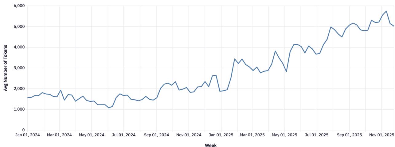 Средняя длина промпта выросла с 1.5k до >6k токенов. Это означает, что пользователи загружают в модели целые документы и кодовые базы.