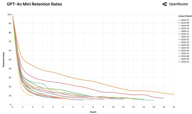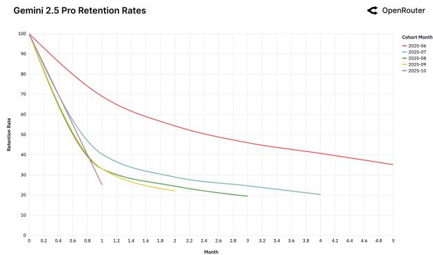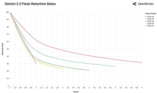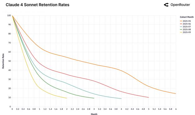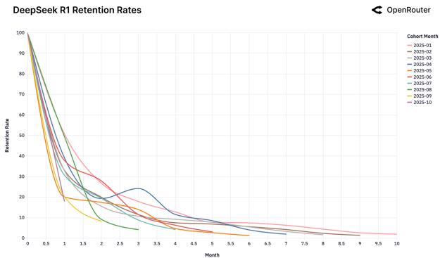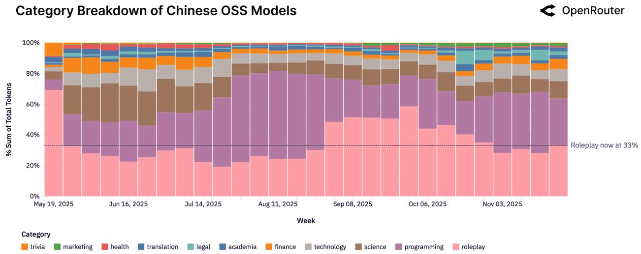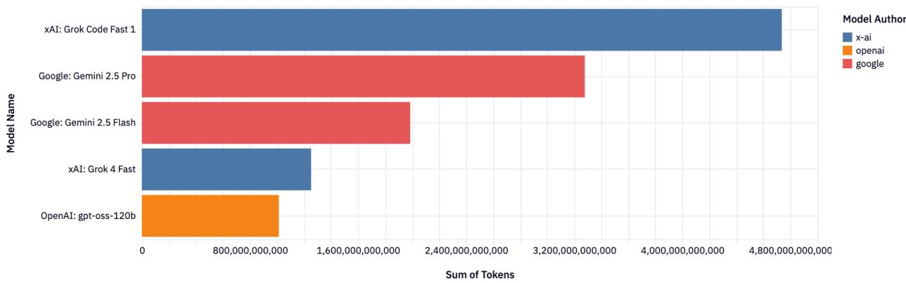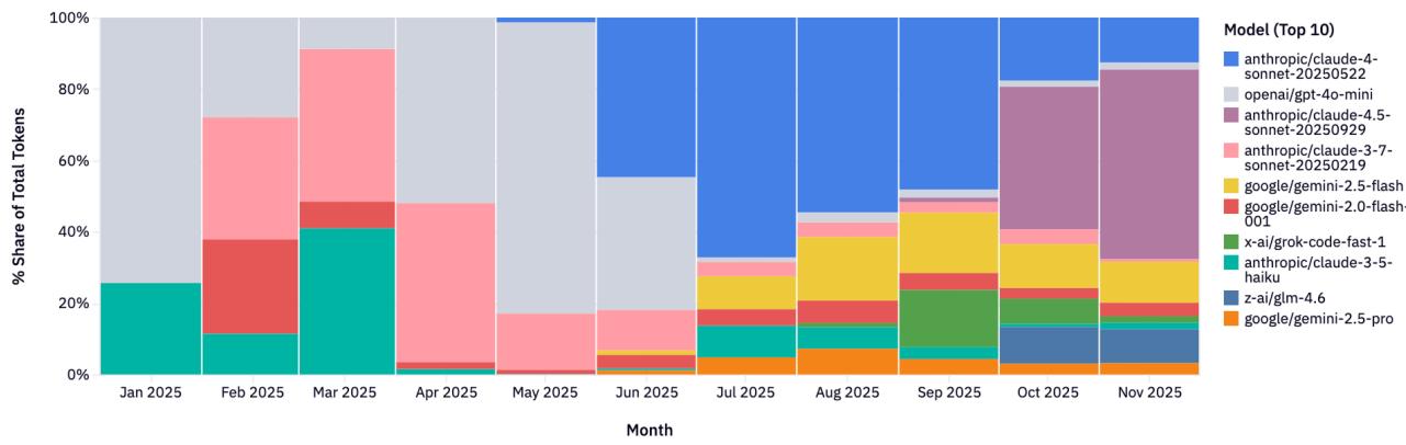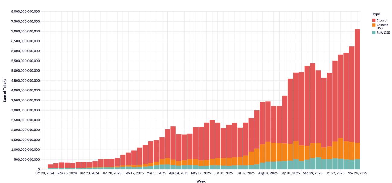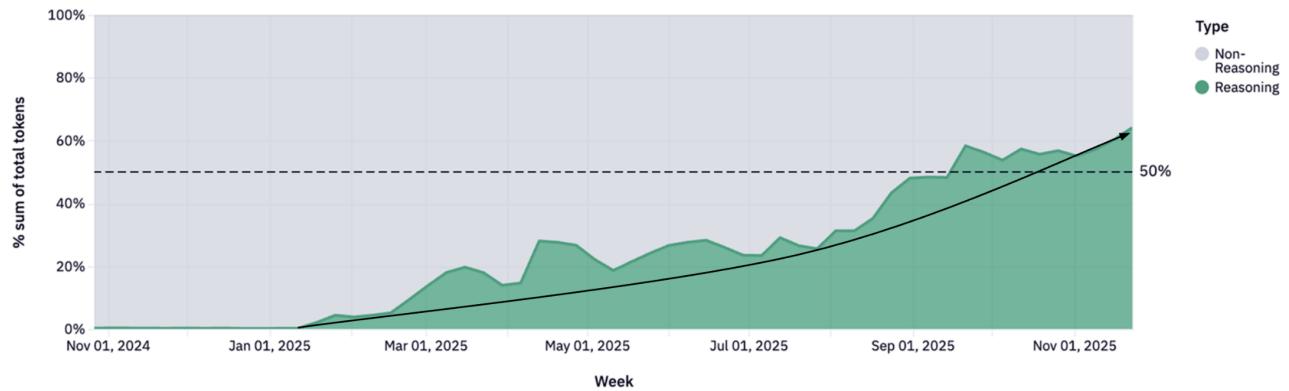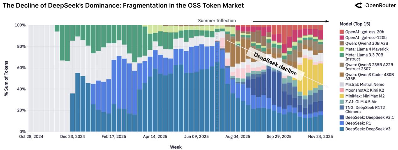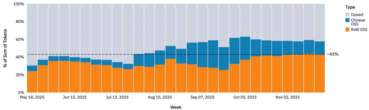 Хотя проприетарные модели (OpenAI, Anthropic) по-прежнему обслуживают большинство токенов, модели OSS неуклонно росли, достигнув примерно одной трети использования к концу 2025 года. Значительная часть этого роста пришлась на модели китайской разработки (DeepSeek, Qwen), которые достигли почти 30% от общего использования.