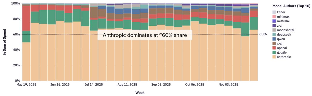 Рисунок 20: Доля рынка провайдеров в программировании. Anthropic лидирует, но теряет долю.